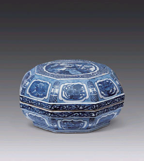 明代嘉靖青花八方开光花鸟纹捧盒