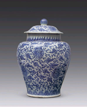 清代顺治青花缠枝蓬纹将军罐
