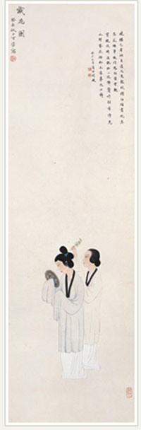 古代书画专场中最引人注目的是晚明女画家、兵部右侍郎汪徵凤的《十八罗汉》卷,著录于《秘殿珠林》,该画保持了宫庭收藏原貌,为典型的清乾隆内府惯用的大镶套边手卷,画心的上下以绫撞边,压磨光滑平整,包首为宫庭云纹绵制作,华美绝伦,其云纹是用蓝色的丝线手制而成,手卷的绦带亦有纹样,可见其制作的精良,尽显皇家华丽。画签为张照于乾隆九年题写,此画完好无缺,十分罕见。