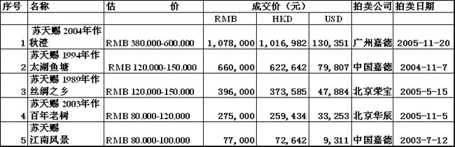 苏天赐是林风眠晚期最重要的学生之一,现任教于南京艺术学院,是中国南方重要的油画家之一。苏天赐作品在市场上一直不是特别热门,原因是市场流动率少,多数人还没有充分了解画家真实的艺术价值。因此市场行情一直没有启动。进入2005年,苏天赐的画价开始上涨,在拍卖市场中的成交率高达100%,这表明苏天赐的作品已经受到买家的普遍追捧。加之近期收藏家们对林风眠、吴冠中的热衷不减,因此苏天赐的作品具备成为热点的可能性。