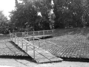 从中国江南收集的六万五千多块旧瓦在草地上铺成了一片简洁的瓦顶,整片瓦顶沿对角线形成侧斜造型,竹编的栈桥从地表延伸到瓦顶深处———参展建筑师王澍在作品中阐释了运用中国本土传统资源演绎现代营造的艺术观念。参展艺术家许江的系列绘画《黑瓦·白瓦》置放于建筑材料搭建成的长廊当中,与王澍的作品两相照映,两件作品形成一位艺术家和一位建筑师关于超越城市的对话。
