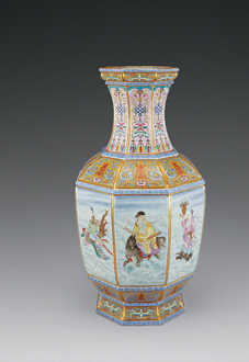2006年中国嘉德春季拍卖中,即将推出清代乾隆时期的一件《粉彩开光八仙过海图盘口瓶》,瓶腹八面开光微微外凸,主题纹饰绘“八仙过海”图。八仙图案是中国陶瓷装饰的典型纹样,至清代,瓷器烧造的工艺水平进一步提高,八仙图案也以更加丰富的形式表现出来,上海博物馆收藏并展览一件《乾隆粉彩八仙过海图盘口瓶》(参阅:《上海博物馆藏品精华》图132),与本次拍卖的这件拍品应为同一时期、同一窑烧制而成,查阅中国及海外各大博物馆的出版物,未见第三件相同传世品的资料。