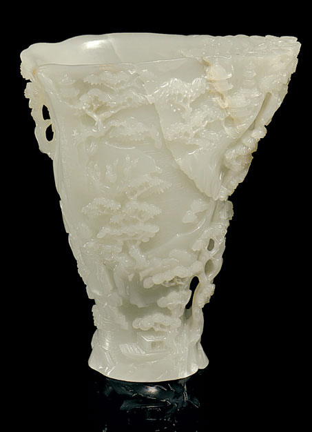 一只估价为1000万元至1500万元之间的“清乾隆御制白玉雕上方山角杯”成为关注焦点。其独特之处在于采用高浮雕及镂雕两种技法精雕细琢而成。