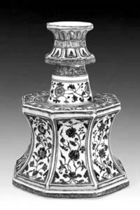 朱汤生介绍,15世纪早期的明代御窑陶瓷厂,制作了大量外销中东地区的瓷器,这些瓷器中大部分是通过郑和下西洋带到中东去的。由此推论,这件青花八方烛台器很可能也是为了适应国外订货的产品。宣德以后,中国转向实行闭关锁国政策。直到清代这些仿伊斯兰器形再也未见,八方烛台更是销声匿迹。