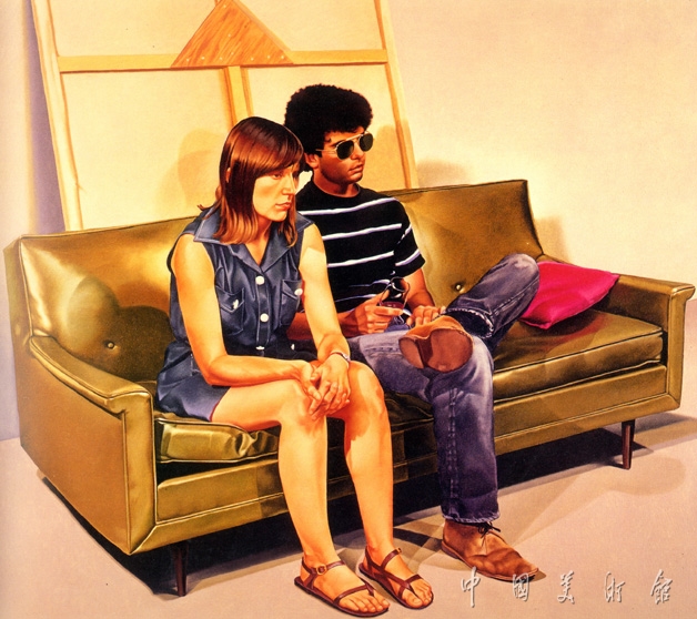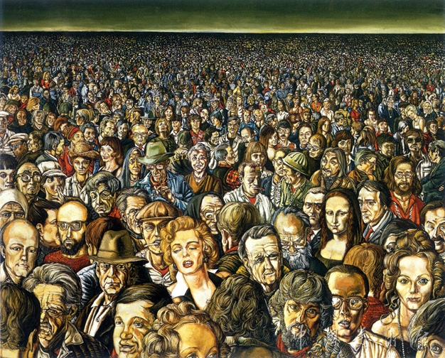 画中的人物看起来似乎毫不相干,他们各自独立地展示着自己,表情或心理都看不出有任何相互呼应之处。正如画家自己所说,他作画时“每次都从一角开始,于相对的另一角结束,从不返回到已画好的人物上”。但仔细辨认一下,在画中各具特色的诸多人物头像中,有许多的人物头像“似曾相识”——他们是意大利画家乔尔乔.德.奇里科(1888—1978)和影星回利.库柏(1901—1961),英国的摇滚音乐家约翰.列农(1940—1980),美国好莱坞的性感名星玛丽莲梦露(1926—1962),还有意大利画家达.芬奇1503年的著名油画《蒙娜丽莎》中的主人公……