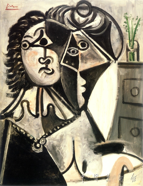 作为20世纪最伟大的艺术家,毕加索一生都在不停地变换着创作风格,用他自己的话说,是对风格的不断地“发现”。在创作《花瓶边的男人和女人,半身像》时,画家已89岁。但从画家对作品中人物的脸部等部位的处理手法来看,我们依然可以找到他早期的立体主义风格的影子。