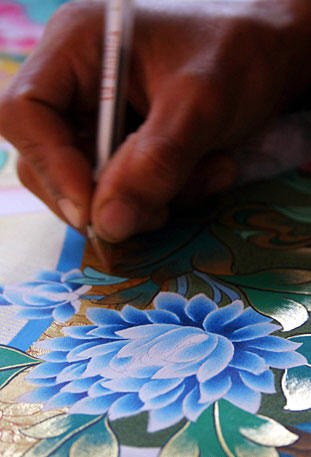 图为加德满都一家唐卡学校的画匠在绘制唐卡