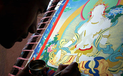 唐卡是尼泊尔十分流行的一种传统工艺品,多在布面、纸面和绢面上进行彩绘,也有刺绣、织锦、缂丝和贴花的织物唐卡。尼泊尔唐卡内容丰富、色彩鲜艳,不仅受到尼泊尔本国人的喜爱,也是众多旅游者青睐的纪念品,更是尼泊尔出口创汇的重要商品。为了让唐卡艺术发扬光大,尼泊尔建立了很多唐卡学校。学校的规模通常并不大,一般只有几个人在老师的指导下绘制唐卡。制作唐卡是对画师技艺、耐心与细心的考验,一名画师完成一幅简单的唐卡作品也要数天时间,更有些唐卡凝聚了画匠数年的心血。