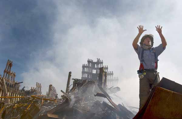 2001年9月14日,美国纽约,在遭遇恐怖袭击的世贸大厦遗址,一名消防员召集另外10名消防员清理碎石。(图片来源:chinafotopress)