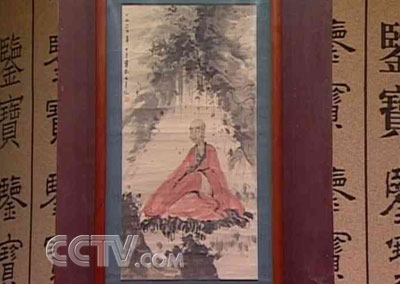 藏品特征:这幅画横29厘米,纵55厘米,画面主要内容是身着红色袈裟的达摩,坐于山谷之中参悟佛理。左侧题款为“一九六四年十月傅抱石并记”,题款下钤盖一枚印章:“抱石画记”。