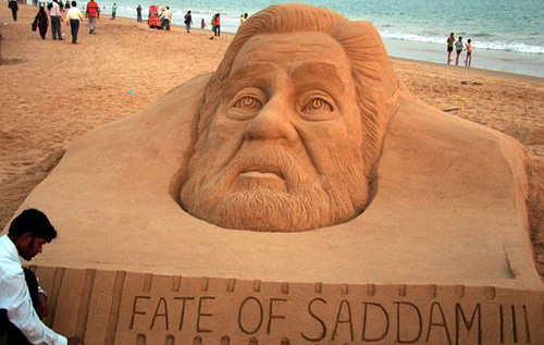 2006年12月27日,印度奥里萨邦Puri海滩,印度沙雕艺术家Sudarshan Pattnaik制作“萨达姆命运”雕像。Sudarshan Pattnaik 在1977年4月15日出生于奥里萨Puri的一个印度教中级家庭,他的童年在Puri的金色海滩上度过,现今作为国际上公认的沙雕艺术家,创立了金色沙雕艺术工作室(Gold Sand Art Institude ),致力于普及沙雕艺术,提升沙雕艺术的国际地位。