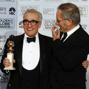 (马丁·斯科塞斯(左)喜获最佳导演奖,羡煞大导史蒂文·斯皮尔伯格)