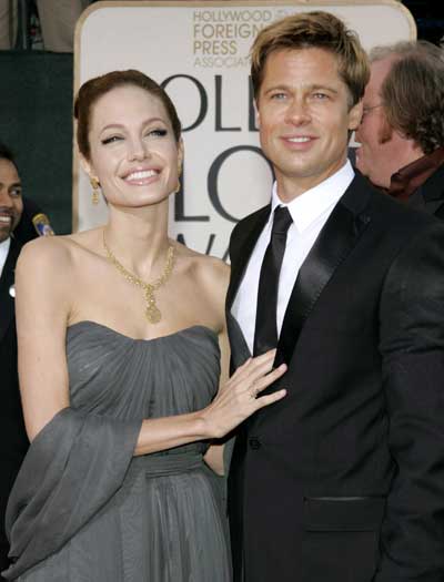 (好莱坞情侣布拉德·皮特(右)和安吉丽娜·朱莉在金球奖星光大道上备受瞩目)