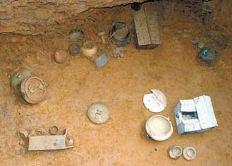 张传余老汉是地道的双墩村人,可是他跟祖祖辈辈的村民一样,对于脚下的这片土地埋藏的千年秘密浑然不觉。直到2006年年初,为配合国家重点工程合(肥)武(汉)高速铁路的建设,安徽省考古队在铁路工程沿线例行考古勘探,行至双墩村,才发现沉睡千年的“双墩”其实是并列的两座西汉时期大墓。从今年3月开始,考古工作人员对南向的一号大墓进行了抢救性考古发掘。目前,此座大墓的封土已经全部揭开,外藏室的清理工作正在紧张进行,近期将开启主棺。