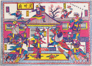 杨:杨家埠的年画早先有一定的规距。由村民们公选出来的印货画业代表,有五个人,我父亲就是其中一个,每年年画开印之前,村里要唱五天大戏,每年农历十月初十正式开工。在唱大戏时年画代表宣布开工,到农历腊月初十停工,挨家查,发现还有人印就罚,还把画割了。这样能保证做年画生意的人买走的年画能在年前卖完,保证他们的市场。但国民党来了开始战乱就没人再管了。