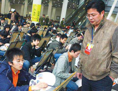 (为增加考试透明度,考生家长金先生应邀为考生抽取设计、美术类试题后,作为特邀嘉宾巡视考场)