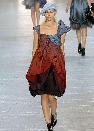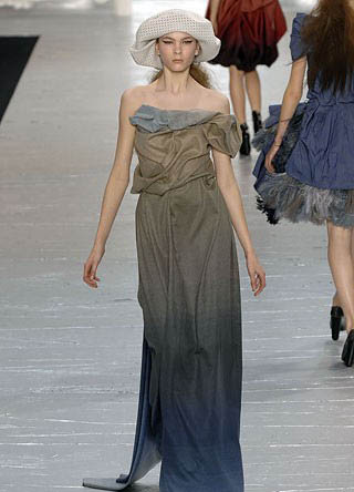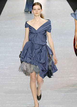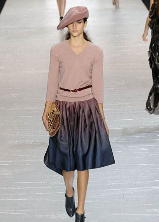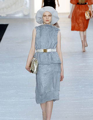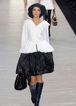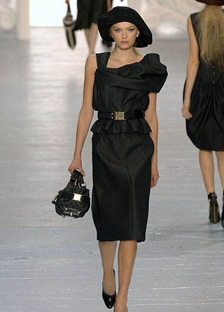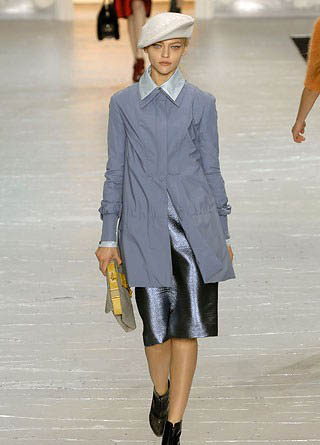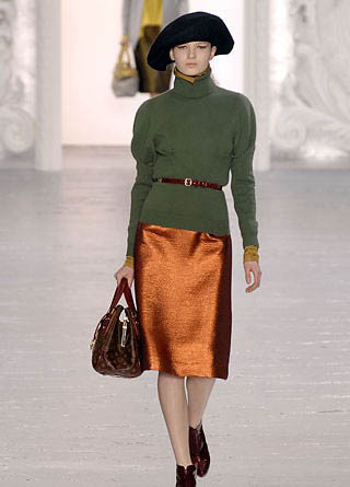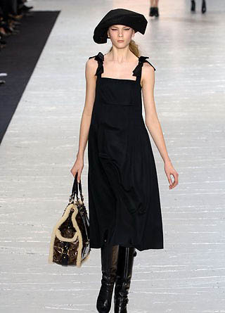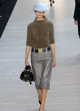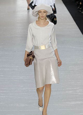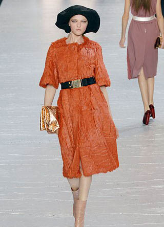 2007年3月4日,巴黎——LV 07秋冬复古优雅,宽松的直筒线条让女人可以自由自在,上衣和洋装都以较挺的材质呈现利落感,腰线的勾勒则全靠腰带,原本宽松的大衣和洋装,外面系上一条腰带就展现不同的风情。色彩以略带灰白的浊色调,表达出优雅感。