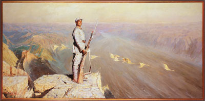 实际上,陈逸飞早在上世纪70年代就在画坛崭露头角,《黄河颂》就是他在1972年创作的。当时年仅25岁的陈逸飞担任上海油画雕塑创作室油画组负责人,他创作这幅作品长297厘米、宽143.5厘米,画家曾自己形容说“一个红军战士,站在山巅,笑傲山河……山顶明亮如炽的光感复还到画布上,渲染成一片耀眼的白芒;红军战士肩挎的步枪枪眼里,一小团红巾,形同一朵盛开的鲜艳的小花,他的脚下,一行斜飞南行的大雁。我自以为很美,既英雄又浪漫。”有专家称《黄河颂》是陈逸飞第一幅独立创作的巨幅宽银幕式油画,注重造型的块面处理和笔触表现,刻画既结实又潇洒,体现了陈逸飞所接受的严格苏联教学体系技术性训练。