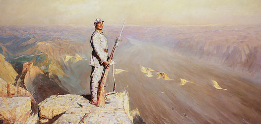 陈逸飞构思《黄河颂》有点像挤牙膏。他不是一下子形成的灵感,而是慢慢琢磨,慢慢修改的。有时候看到画报上的照片,突然会激动地喊出来:“这个画面好!”张安朴透露了一个现在很少有人知道的情况,其实陈逸飞的《黄河颂》共画了2张。他最早画的是一个头上扎着毛巾的民兵,远处还有几头他放的羊。“我曾经收藏的就是第一幅画的小稿。”后来第一幅画被否定掉了。重新创作时,陈逸飞将人物改为战士。画面也变得更干净利落。这两幅油画《黄河颂》一样大小,只是第一幅画早已不知踪迹,成了一个谜。真不知道是否还会在什么时候,在哪里又突然出现。