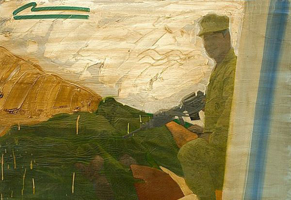 这幅名为《战争画前奏》的作品取材于2005年在伊拉克拍摄的一张照片。画中的战士是创作者的侄子,他在画中的战场上歼灭了3名敌人。