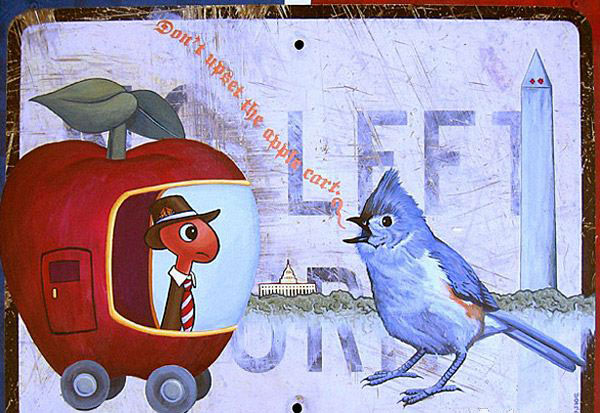 在名为《政府工作》的作品中,创作者的灵感来自于自己的父亲试图与联邦政府合作解决印地安人问题的生活经历。画中的山雀说道:“不要弄翻了这辆苹果车。”在印第安切罗基族人的眼里,山雀是不值得信赖的动物。