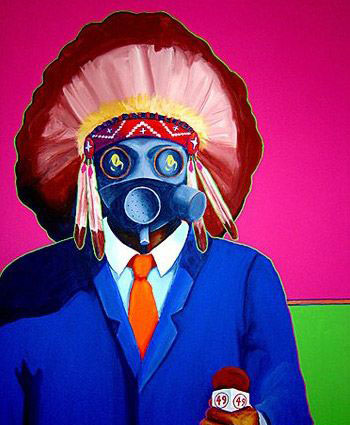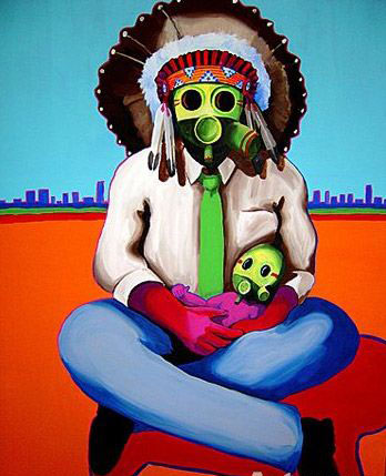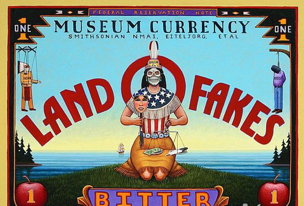 作品《Land O'Fakes, Land O'Bucks》控诉了那些利用印第安人形象牟利的公司。