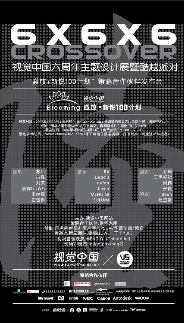 “6x6x6 CrossOver 视觉中国六周年主题设计展暨酷越派对”以及 “盛放+新锐100计划”策略合作伙伴发布会将于2007年年4月20日晚7:30点在北京歌华创意中心举行。届时,中国17位顶级新锐设计师和前卫电音艺人将盛装登场,并与全场1000位来宾共同见证一场充满惊艳的视觉艺术派对!