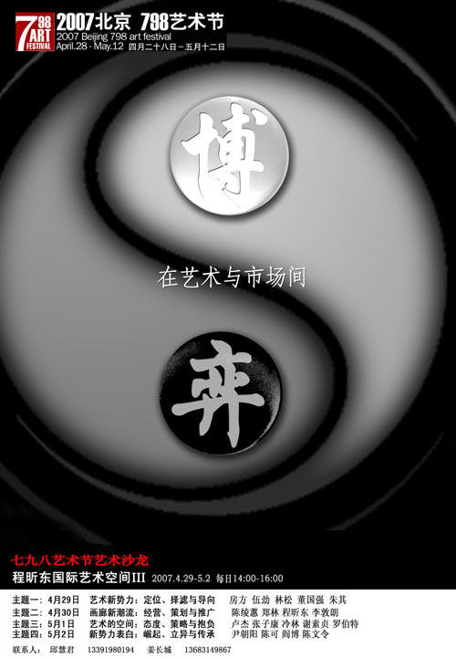政府想将798做成创意产业园区,我们的论坛当然也具有创意,一个是我们的确“创”立了为期四天的艺术节论坛,并且打造了一个业界精英和观众以及作为当下重要力量的媒体从业人员的对话与交流的平台。而作为主办方,我们也当然也是有着自己的“意”图,那就是通过对话与交流将艺术与市场对接,将市场推广力量和艺术家对接,将业内专家与观众及传媒对接,通过这一系列的对接,我们期望达到使艺术与市场在知性的博弈中获得动态的、趋向良性的、具有丰富层次的平衡,进而能够引导艺术产业生态链条的稳健和积极的运转,那就是我们真挚希望达成的意图。所以,在这个2007 年的4月,我们将期待各位来与我们一起将“创意”唱响!