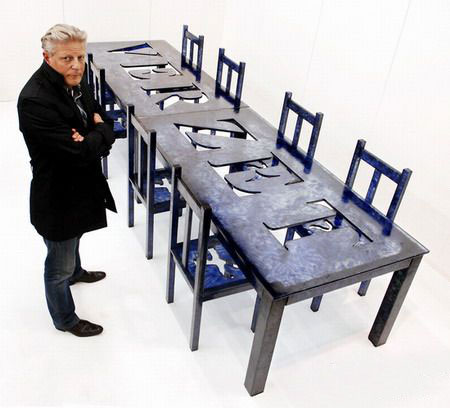 2007年4月,在比利时艺术展览上,杰恩-法布尔,比利时最有名的艺术家之一,站在他的艺术作品“绝望骑士之桌”(Table for the Knights of Despair)旁。这张桌子及配套的8把椅子包含650kg重的彩绘玻璃,所以被认为是世界上最贵的桌子。桌子上的写着荷兰语的“忍耐”。
