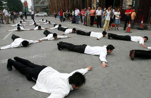 6月4日,中国当代6位知名的行为艺术者苍鑫、北水、黑月、也夫、二毛、赖月伶(台湾)在北京“味道--江湖菜馆”联手举行“饕餮--江湖”行为艺术及图片、影像装置作品展,对时下餐饮文化用各自的观念和方式做出阐释与演绎,探讨消费时代的身体、性别、食物、味觉安全与主体性的复杂境遇。图为行为艺术者苍鑫在现场演绎50人的“苍式体操”。