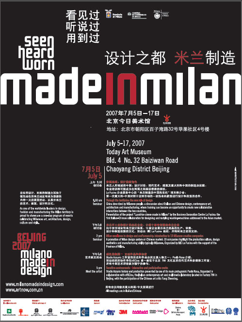 The 5th July 2007,three seminars of the exhibition “ Milano Made in Design” will be held at Beijing Today Art Museum. Many important designing experts, representatives of creative industrial designing companies and professors of well-known designing institutions from both countries will be present discussing subjects on modern design and modern art, we request the pleasure of your company!