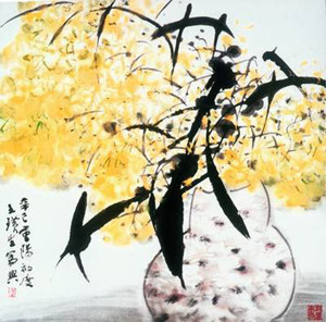 关于王先生的花花事事,着实令人赞叹,着实有自己的花貌与个性。他说,大千世界可以无限的丰富,不拘一格,种花插花画花也应如是。花开花落,有枯有荣,这是生命的历程。这样可以更为自由的运用花的语言对生命力的理解、歌颂与赞美。我们从王璜生的花路历程中可以看到,作者笔下的种种花,是一种抽象化了的符号,是他对现代都市与自然的独特感受的表现。在构图上,他强调美感及情感的表达。于是,他笔下常常出现了瓶花之作,这在作者看来,似乎更为恰当、准确、直接、痛快的表达、抒发自己的感情,同时也希望是都市生活与自然的“合一”。我们既可从其用笔的味道中找到传统,又可以从用色淋漓中找到现代的东西,两者自然结合,溶为一体。
