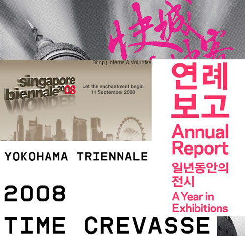 2008年9月,世界各地区的双年展和博览会都拉开了帷幕。亚太地区五大双年展合作打造的“亚太艺术罗盘”:9月7日闭幕的悉尼双年展、9月9日开幕的上海双年展、9月11日开幕的新加坡双年展、9月13日开幕的横滨三年展(Yokohama Triennale)、9月15日开幕的光州双年展(Gwangu Biennale),旨在横向连结这5个亚太城市的年度艺术盛事。除此之外还有国内的广州三年展、和南京三年展、艺术北京等也呈现鼎立局面。面对如此繁多的当代艺术盛事,批评的声音也变得褒贬不一、良莠不齐。