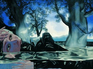 熊宇的创作正是在这样的一个语境中起步的。在1999年到2003年这段时期,艺术家创作了一批具有强烈个人风格的作品。画面的主题大多是一些年轻人,他(她)们没有明确的性别特征,但形象则惊人的相似:迷人的大眼睛、硕大的脑袋、细长的脖子、孱弱的身体。尽管他(她)们都是一些卡通化的人物,但熊宇并没有刻意拉大这些人物与现实生活的距离,换句话说,我们多少会被那种或忧郁、或伤感、或迷茫的情绪,及其特殊的个性与气质所打动,从而产生情感上的共鸣。之所以会被打动,还在于我们无法回避他们那双“迷人”的眼睛。因为在阅读画面的时候,“看”和“被看”似乎也不存在着原有的主动与被动关系,因为观众与画中人物的“凝视”已消解了横亘在主客体之间的界限。这是一个互为镜像的交流过程。在谈到为什么要画“大眼睛”人物时,熊宇曾这样解释道,“我喜欢有眼神的交流,所以把眼睛画大,像是一个注视。瞳仁是蓝色的,是因为我觉得蓝色特别透,我希望他的眼睛带出的是透澈的感觉。”[7]为了营造一种诗意、梦幻的画面效果,艺术家的方法是将他笔下的人物置身于丛林、山谷、池塘、大海等场景中。由于这些场景没有具体的上下文关系,也不具有社会学叙事的意图,所以,画面呈现出的完全是一个自律而封闭的生存世界。当然,对于艺术家而言,与其说这个世界只是一个表象、一个经过图像化处理后的自然环境,不如说这是精心构筑的一个属于自我的世界。
