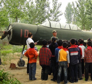 在韩文斌的露天博物馆停放的四架装配完整的飞机中,一架军绿色飞机引起了学生们的注意。韩老很高兴地当起了讲解员,滔滔不绝地向孩子们讲述着这架飞机的故事:“这架飞机名叫亚克—18,是世界上公认的最好的教练机,如果想学开飞机,就要先从这架飞机上学怎么起飞怎么降落……”韩文斌如数家珍般介绍着,学生们听得津津有味。