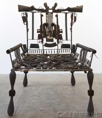 据外电11日报道,近日一名来自非洲的艺术家独具匠心地用废弃的武器,巧妙地组合成了一系列艺术品,其中一张令人恐怖的王座,更是创意十足。