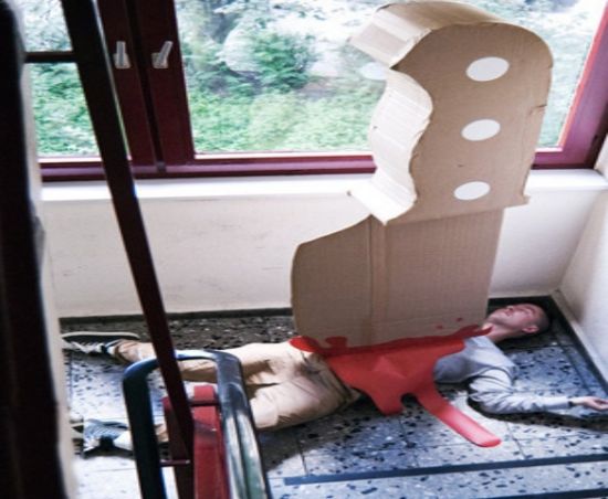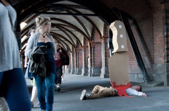西班牙艺术家MariaLujan和Wolfgang Krug共同创造了《TheKnife》街头行为艺术项目。两位艺术家走上街头、躺在地上、靠在墙角……将一把巨大的纸箱刀“插在”肚子上,用红色纸张制造出鲜血淋漓的逼真场面,着实夺人眼球,恐怕路人在惊叹的同时不得不佩服他们的另类创意。