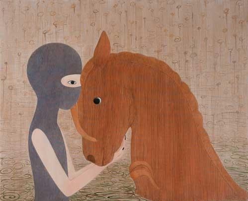 俞洁新近的绘画,放弃了前些年那些带有涂鸦意味式的即兴方式,更多了“写”的成份,作为一个强调东方性的艺术家,她的绘画都带有某种叙述性,被克制住的抒情,巧妙隐藏起来的冲突,让她画面停留在诗意和戏剧性之间的瞬间里,这使得她的每幅作品后面都隐现一个事件。在她的绘画中,人没有个性,甚至没有性别,动物具有“人味”,它们之间有着平等、互换、交融的隐秘联系。因此画中的鹿角、兔头、兽皮,空气、树、星空以及惊异的眼睛成了启示式的符号。正是通过这些符号,俞洁将其日常经验转化成个人寓言。习惯当下艺术的人,凭经验会将其看成卡通式的欢愉,但她透露的冥想气质,使认真阅读其绘画的人,从中发现东方式的智慧和觉悟。她是以温和的形式将现实性隐匿到形象后面,制造了很多看起来过于干净的画面,人物形象都有自足性,这些人和物都沉浸在自己的专注中,而不与看它的人(观众)对视,也就是说没有发现“被看”。此次“仪式”俞洁个展展出的作品代表了俞洁近段时期的艺术思考。