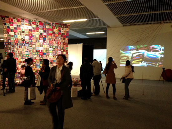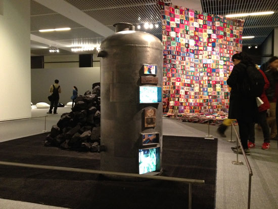 本次在国家博物馆展出的作品,是艾敬在之后对祖国、对家乡的一次深沉的情感回归和艺术价值的挖掘。其中的作品《我的母亲和我的家乡》,是艾敬现阶段创作理念的集中体现。其母亲带领发动了家乡沈阳的近50名亲戚、朋友和邻居共同参与制作,采用参与者家中废弃的旧毛衣、毛裤以及其他旧毛线,重新编制一幅宽6米,长16米充满“love”字样的挂毯。色彩斑斓的“love”挂毯前,端坐着一位母亲埋头编织的雕塑形像,这个形像以艾敬的母亲为原型来歌颂深沉而厚重的母爱。作品的气度和涵义彰显了北方文化的地域特性,以及艾敬对家乡故土的深情。同时展出的有关家乡的装置作品《我的家乡》,以废弃锅炉重新装点出全新的视觉体验,现场观众可以通过“锅炉”中装置的四个影像体会北方的情怀氛围,通过浓烈的情感体验给初冬带来暖暖温情。