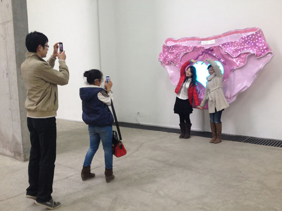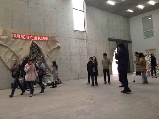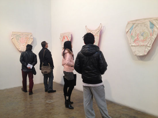 进入展厅的第一件作品是王智远在阿姆斯特丹展出的《龙卷风》作品的延续,他是艺术家,也是一个真正的手工艺者,他巧妙的利用现世装液体的塑料瓶及瓶盖穿插一起塑造形象。“内裤”系列作品的全套15件是第一次在国内展出,展厅的另一件作品“他们”也是第一次展出,由200个小铜人组成的作品陈列在空间白墙上极具视觉震撼力。从2005年就创作的“他们”系列作品,王智远一直觉得不太满意,直到8年后才将其展出。王智远坦言这是和程昕东艺术空间的第一次合作,场地的展示效果让他颇为满意,在程昕东当代艺术中心的C空间里,5件大装置的并置并不显局促,反倒相得益彰。