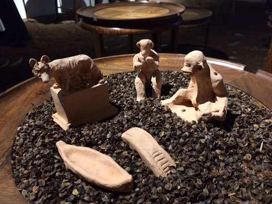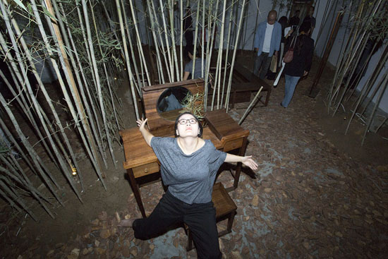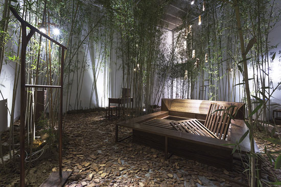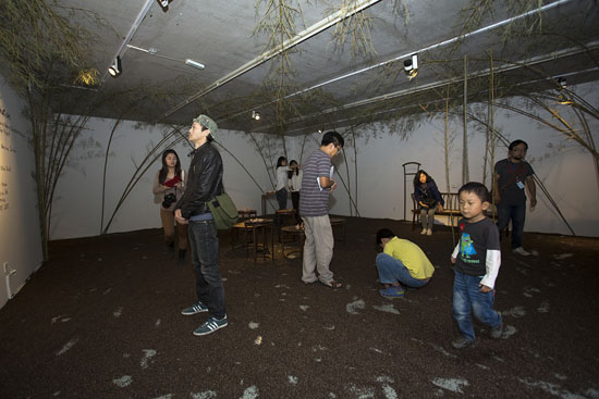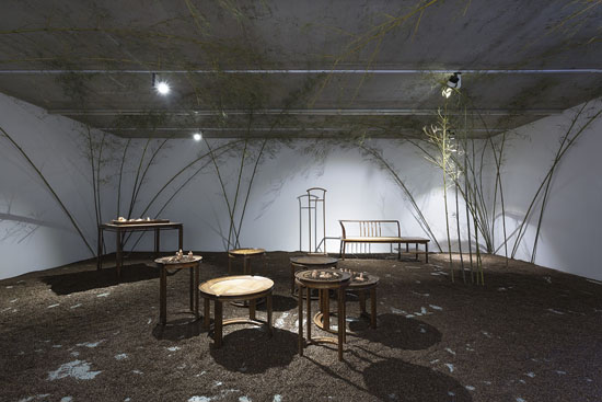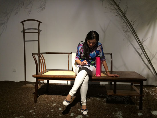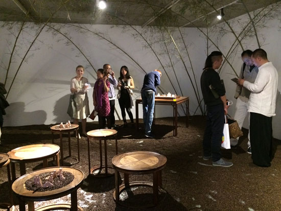 进入展厅,仿佛与世隔绝。主展厅除了展示家具设计和艺术作品以外,地面还铺满了荞麦皮。荞麦皮多产于中国的陕西、内蒙古、四川,因其呈棱形、坚而不硬,加上透气性好,经常被填充枕头使用。荞麦皮还有一个最重要的一个特征就是耐用性,荞麦壳能在地下埋藏百年不变质,常经日晒和水洗不变质。此次与原创家具一同展示,家具除设计外观外质量不言而喻。副展厅布置得更下功夫,像走进了竹林。墙四周种上了竹子,除了展示的家具外,地面还铺满了厚厚的树皮。与荞麦皮的寓意一样,体现了桌、椅、屏、几等家具的耐用、绿色、无污染。
