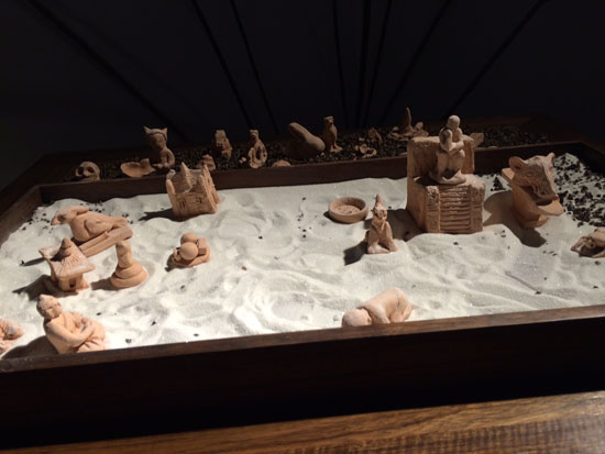 于伯公的“内心之帐”沙盘游戏,是将很多小雕塑放置在白沙和荞麦皮上进行展示。沙盘游戏疗法(sandplay therapy)由瑞士荣格心里分析师多拉·卡尔夫(Dora Kalff)创立,本身以荣格的分析心理学、洛文菲尔德的“游戏王国技术”以及中国文化与哲学为基础而建立。荣格形容沙盘游戏为:“一种对身心生命能量的集中提炼”。在荣格心理学原理的基础上,多拉·卡尔夫发展出运用意象,即“积极想象”进行治疗的创造形式。沙盘游戏需要心灵的自由,以及充满安全感的氛围——在一个“自由与保护的空间”内,通过沙子、水和沙具,沙盘游戏者营造出个人心灵深处意识与无意识之间的持续性对话,由此而激发出心灵与自性的发展。