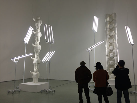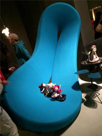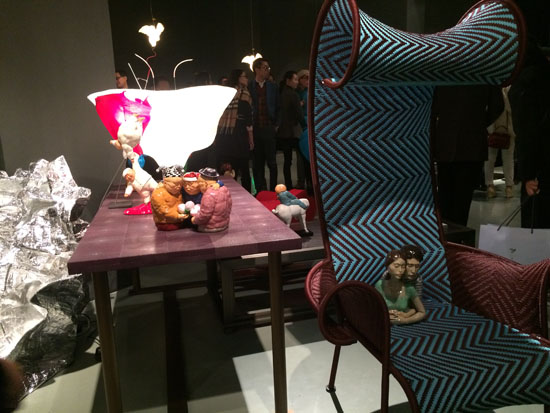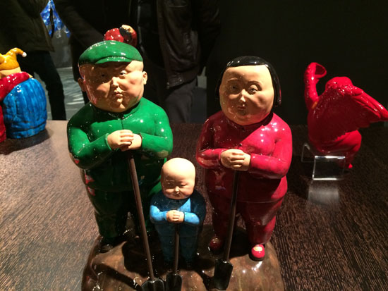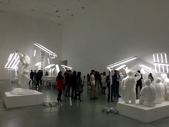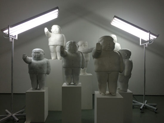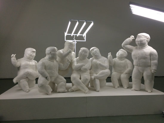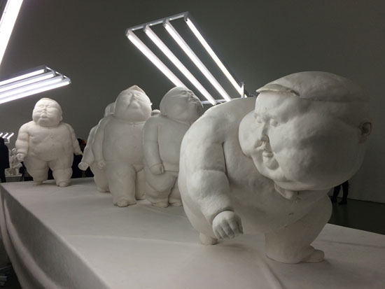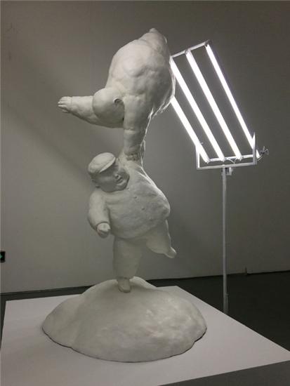 瞿广慈的雕塑作品如同文字般具有很强的叙事性,同时巧妙地加入晦涩的隐喻,使得语言不详的态度在雕塑作品的本体与空间的相持状态中表现得更为直接、具体。为了描述这样一个理想的国度,瞿广慈通过主厅与副厅之间的强烈对比,形成了不同的感觉,让观众从中体会着属于自己的那个“终北国”。主厅还原了艺术家的工作室,大型白色雕塑在工作照明灯光下,作品的转折起承历历在目,他的那些胖子似乎在这个“终北国”才显出了他们的原型,或各自横走纷飞在展厅的四处,或互相竖起拇指点赞对方,观者似乎进入五维空间,同时看着他们在“终北国”的生活百态,为之悲喜;相反,副厅则以那些多彩的“稀奇”限量版雕塑为主,与家天地精选设计家居品共同营造出未来风格的高端家居氛围。通过这两种反差,展览映射的是物质追求与精神追求的相悖与合一。