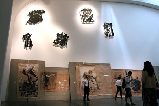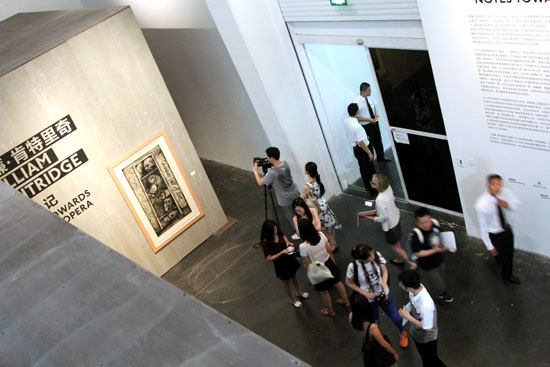 由UCCA馆长田霏宇策划的“威廉·肯特里奇:样板札记”于6月26日开幕,展览展出艺术家从1988年到现在的多件重要作品,是迄今为止这位艺术家在亚洲最大规模的展览。本次展览同时涉及多种媒介:既有纸上印度墨水、炭笔、麻胶版画、丝网印等平面作品,也有杜尚式的现成品动态雕塑、以投影方式呈现的多频影像,以及带有机械木偶的舞台模型装置作品。