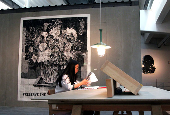 最后,在展厅的二层,一间阅览室与展览“样板札记”同时开放。在那里观众可以精读威廉·肯特里奇的艺术家书籍,近距离欣赏他的短片,其中包括艺术家里程碑式的作品《二手阅读》在内的一系列手翻书,这些书籍为艺术家探索绘画、影像、摄影之间的关系提供了一种新的形式。观众亦能在阅读室观看肯特里奇的《绘画课》——他以特有的半开玩笑式风格拍摄的录像作品——一系列教授如何在工作室创作艺术的、兼具教育和艺术两方面内容的教育片。