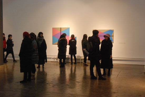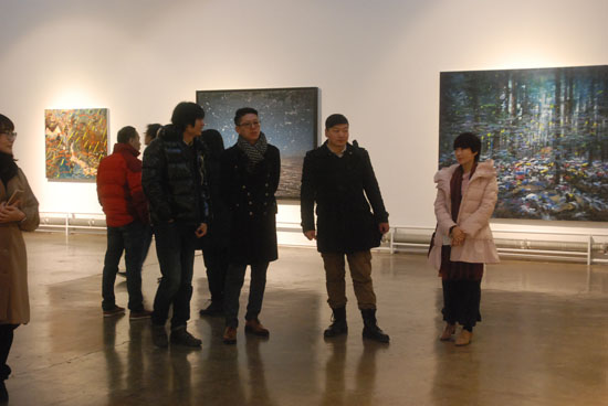 左起:艺术家张方白、尚扬、冯放在展览现场观看作品