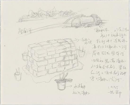 尹秀珍《洗河》(行为)手稿 25x31cm 纸上铅笔 1995