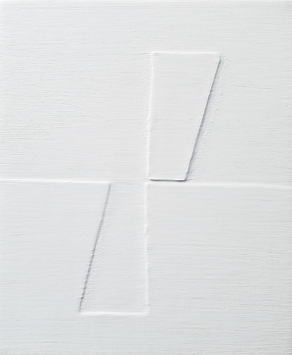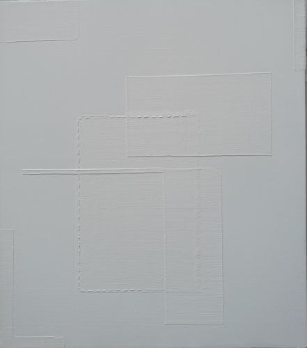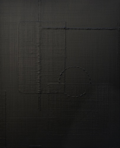 虽然黄佳将造型语言精练化、纯粹化,减少到最小的基本点或者线,初看有点“理科”思维的形式表达。但不同于其他艺术家的抽象作品,黄佳将与女性身份的缝补的线条,纱布带入画面,这或许是她作为女性艺术家不自觉的选择。在她单色、极简、几何、冷静的作品外表下,依然可以感受到温暖、人性、柔和。