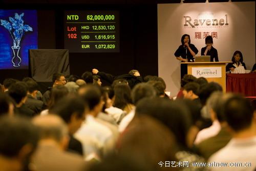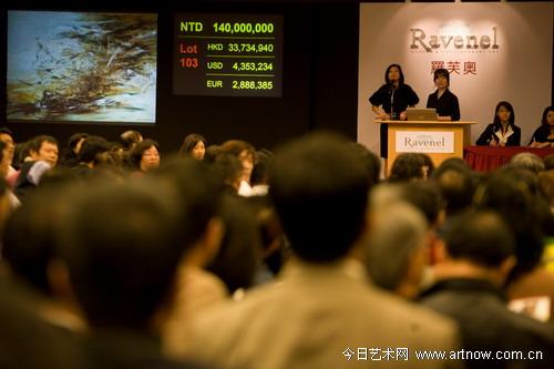 “罗芙奥台北2009秋季拍卖会—亚洲现代与当代艺术”于12月6日14:30在台北富邦大楼国际会议中心盛大举行。从预展期间的人潮,即可预见拍卖时的热烈气氛。拍卖现场座无虚席,有数百位艺术爱好者领牌参与竞价。这场艺术拍卖原本预估金额为港币9千万元至1.2亿元,最后拍出港币1亿6098万4096元的漂亮成绩,金额成交率高达到164%;227件拍品有192件找到买主,件数成交率约为85%。