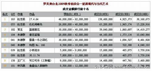 原题:罗芙奥台北2009秋拍总成交额港币1亿6098万元 赵无极《17.4.64》创台湾拍卖市场最高价